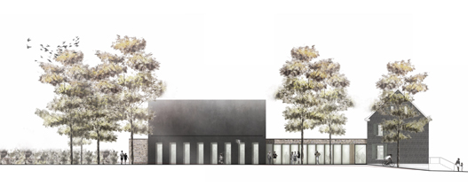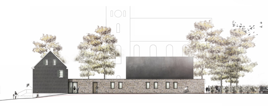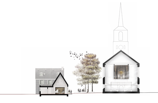 Der geplante Erweiterungsbau fügt sich in die gewachsene Struktur ein. Im Schwarzplan ist diese behutsame Ergänzungb ablesbar. Der Saalbau nimmt durch seine Dachform und Dimension Bezug auf die historischen Bauten im Umfeld und auf das Kirchenschiff. Die Eingeschossigkeit des Foyer- und Eingangsbereichs gewährleistet eine größtmögliche Freistellung und Wahrnehmungdes historischen Gemeindehauses. Die Gesamtanlage mit Kirche, herausgestellten Saalbau und historischen Gemeindehaustritt in Dialog mit dem Stadtraum. Das neue Kirchenumfeld mit dem gemeinsamen Eingangshof für die Kirche und das erweiterte Gemeindehaus ergänzt den Stadtplatz und die Fußgängerzone auf der gegenüberliegenden Seite der Kaiserstraße. Dieser Kirchenvorplatz ist mit wenigen Ausnahmen frei vom ruhenden Verkehr, der hinter das Gebäude verlagert wird. So lädt er zum Aufenthalt und zum Verweilen ein.